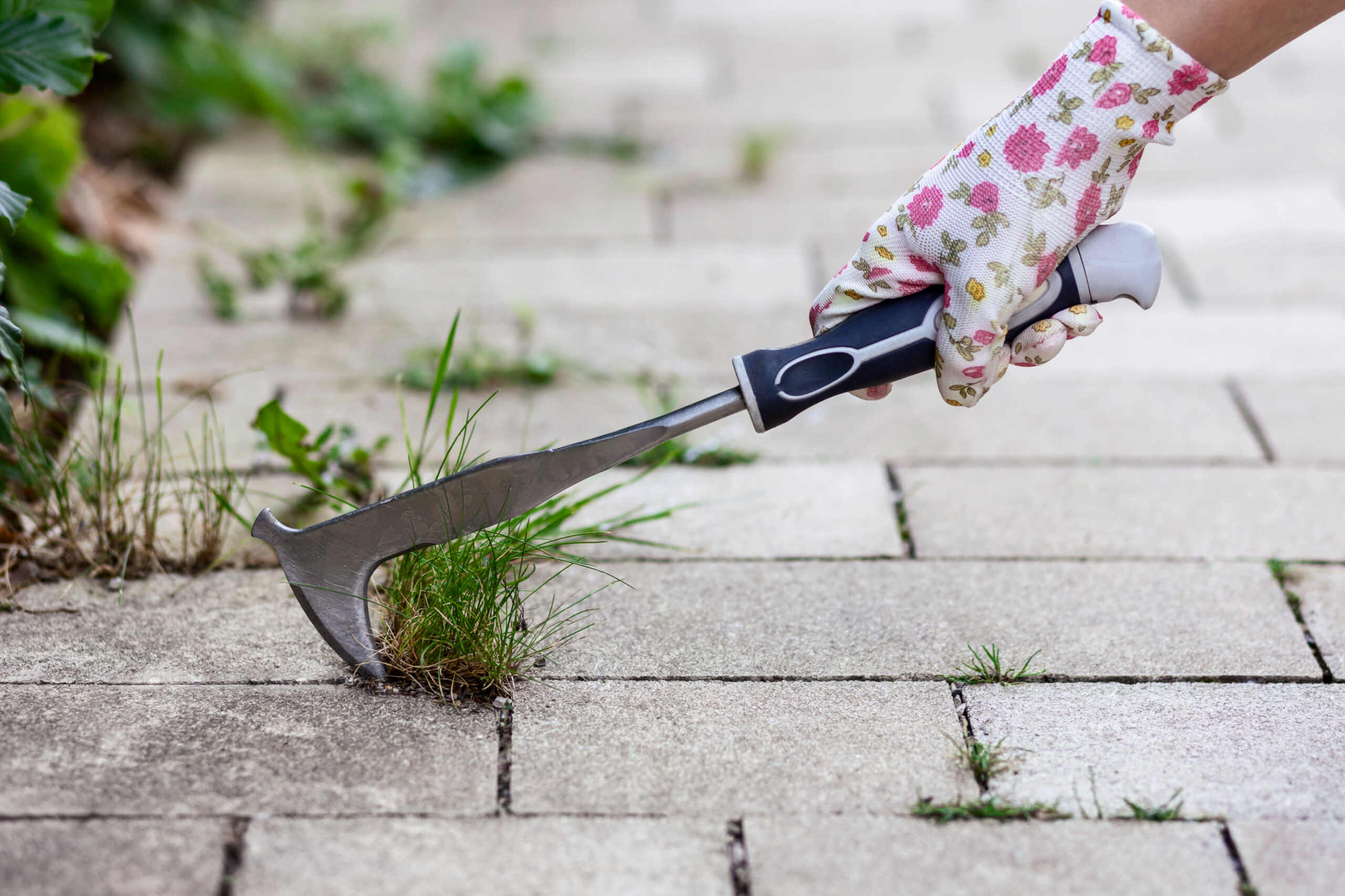Verwijderen van onkruid tussen tegels, klinkers en opsluitbanden.
